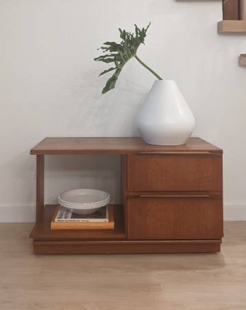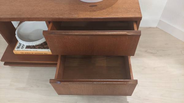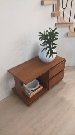 I know the Perfect Cubby for your Favorite Books or Vinyls 🖤 Very cool and unique side table in amazing vintage condition. Very cool and unique console table. Beutiful Teak wood, and sits on small rollers for easy movement.