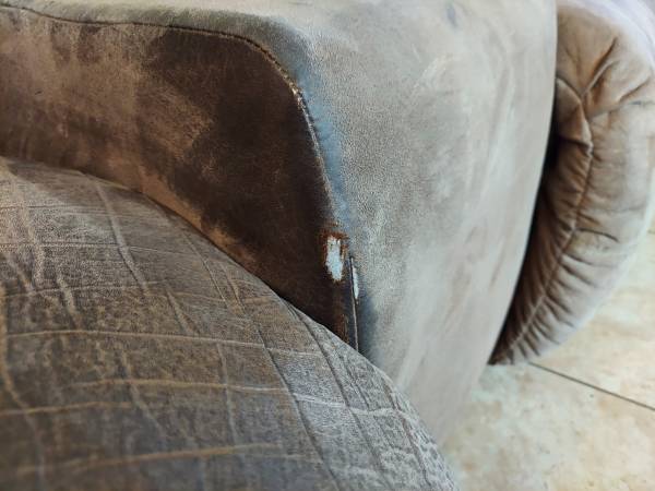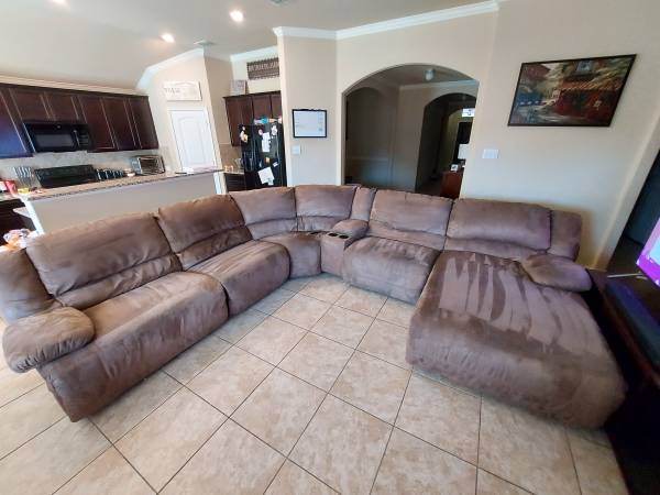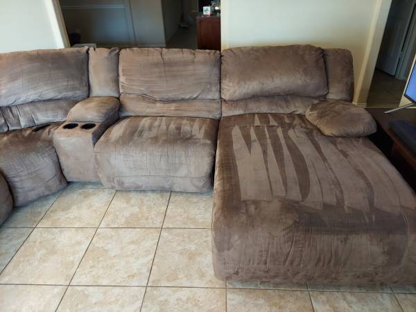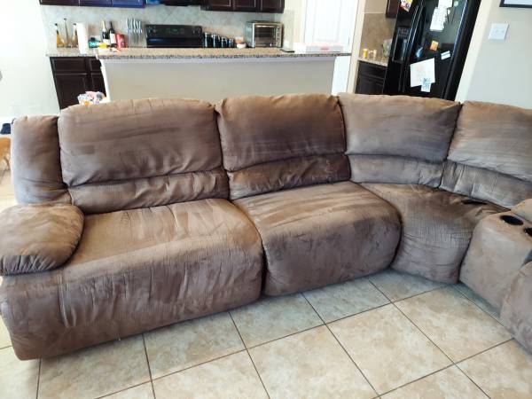 Brown microfiber 6-piece sectional couch. Originally purchased from NFM years ago. Has some wear (see picture), but still comfortable and a lot of life left. Has two cup holders and storage under the center armrest. Two footrests extend, but the cables are broken.