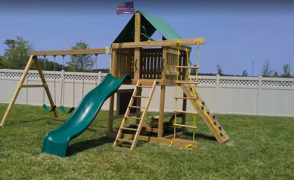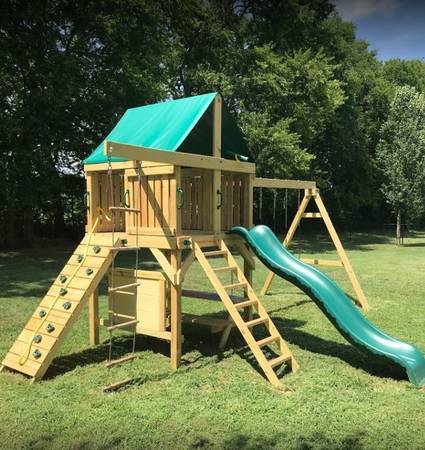 This is a fantastic, solid swing set made by The Swingset Co. You can find it on our website theswingsetco.com. It’s brand new, on a pallet. The playset fort is 5ft x 5ft, which is pretty big, and is 5ft off the ground. It’s a very strong set built with 4x4 posts. The majority of the parts are already pre-assembled by the factory (walls, ladders, rock climbing wall, fort floor, picnic table, etc. are all assembled already).